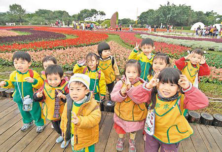 臺北花博16日進入開館第11天,幼兒園的小朋友們首次來到新生園區參觀,開心地在花海前合影留念。 圖片來源:臺灣《中國時報》