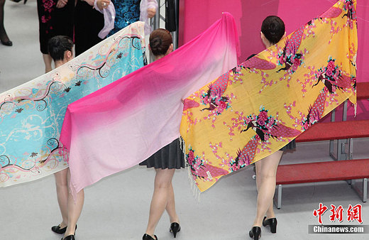 3月21日下午,由上海市婦女聯(lián)合會主辦的“花開臺北·海派女性風采展”在臺北開幕,滬上112位杰出女性代表身著各式旗袍亮相花博會流行館,與相聚在此的臺灣婦女會總會姐妹們暢敘友情。圖為上海婦女代表團成員現(xiàn)場表演絲巾秀。中新社發(fā) 符永康 攝