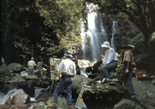 循北插天山登山口左側蚋仔溪岸前行,約20分鐘后,氣勢澎湃的滿月圓瀑布(啦咔瀑布)首先映入眼簾,高十余公尺的水瀑轟然墜下,從觀瀑亭可一覽無遺;處女瀑布則位于蚋仔溪的支流上,循觀瀑亭下方指標前往約需15分鐘,瀑水如布簾直瀉而下,水氣氤氳,氣勢之壯與滿月圓瀑相當;惟瀑布下方部分水域湍急潭深,賞瀑應于一旁的觀瀑樓,切勿接近溪谷。