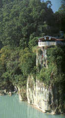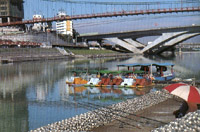 碧潭位于新店市北部,是大臺(tái)北地區(qū)歷史悠久的游覽勝地,也是許多老一輩臺(tái)北人舊情綿綿的約會(huì)地點(diǎn)。碧潭因岸邊山壁陡立峻峭,又稱赤壁潭,地當(dāng)新店溪的中游,此處山峰回轉(zhuǎn),河岸特別寬敞,水色澄碧,平緩深廣,在新店溪沿岸素享盛名,曾被譽(yù)為臺(tái)灣的十二大勝景之一。 碧潭最具代表性的景觀,首推碧潭吊橋。建于1937年,橋長200公尺的碧潭吊橋,宛若長虹臥波地點(diǎn)綴著碧綠的潭水,佇立橋上,俯望葉葉小舟悠游于天地間,遠(yuǎn)眺新店溪曲折迂回行來,山光水色,明麗秀朗;然年事已高的吊橋,已出現(xiàn)鋼索斷毀的老態(tài),為安全起見,臺(tái)北縣政府已積極展開救援工作,依原貌整修舊橋,讓碧波橋影成為碧潭恒久的標(biāo)記。 北二高碧潭橋?yàn)楸烫兜默F(xiàn)代奇景之一,長850公尺的弧形拱橋,主孔跨徑長達(dá)160公尺,是島內(nèi)目前最長的預(yù)力混凝土箱形橋梁,恰與老舊的碧潭吊橋形成強(qiáng)烈對比,為碧潭帶來全新的景象;而河岸親水公園及小木屋賣店,也增添了西岸的游憩性。 黃昏時(shí),潭面籠罩在一片霞光之中,夕陽余暉,美景無限;夜晚的潭邊則聚集了一群攤販,構(gòu)成極富鄉(xiāng)土味的小市集。夜游碧潭,別有一番風(fēng)情;若時(shí)間充裕,也可在此住上一夜,細(xì)細(xì)欣賞碧潭晨昏之美。 乘車風(fēng)向標(biāo):