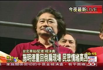 回到“倒扁”活動現場后,施明德上臺向民眾信心喊話,他痛斥陳水扁不要忽視人民的聲音,不要以為紅軍如此就會潰散;“倒扁”的民眾仍會繼續下去,直到陳水扁下臺的那一天。施明德也向大家說明,目前他的身體狀況良好,會堅持下去。(趙靜)