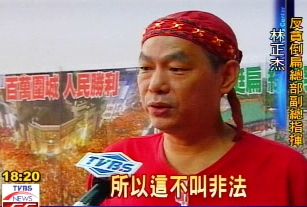 林正杰20日首度站上“倒扁”靜坐舞臺,他向在場在民眾喊話,“你們?nèi)虩o可忍的時候,我就把我的生命交給各位,一起沖,好不好?”