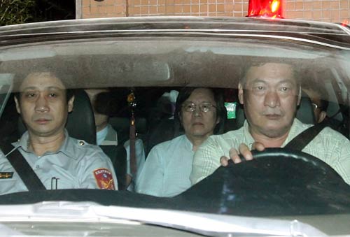 臺(tái)灣特偵組30日晚間傳喚臺(tái)當(dāng)局前“國(guó)安會(huì)秘書(shū)長(zhǎng)”邱義仁(中)及5名證人到案。檢察官偵訊后認(rèn)為邱義仁涉嫌利用職務(wù)詐取財(cái)物罪嫌,于31日凌晨將邱義仁移送法院聲請(qǐng)羈押禁見(jiàn)。臺(tái)北法院審理后裁準(zhǔn),邱義仁坐進(jìn)囚車(chē),被送往臺(tái)北看守所。“中央社”圖