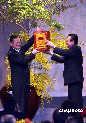 十一月四日晚,國民黨榮譽主席連戰、連方瑀伉儷在臺北國賓飯店設宴款待陳云林訪問團一行。中新社發 洪少葵 攝