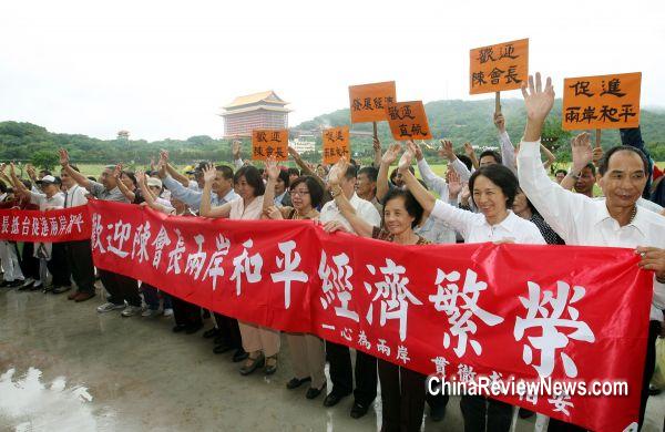 大陸海協(xié)會(huì)會(huì)長陳云林到臺(tái),臺(tái)灣的民間團(tuán)體“中華兩岸事務(wù)交流協(xié)會(huì)”發(fā)動(dòng)支持者到陳云林下榻的圓山飯店下方河濱公園,舉布條歡迎。圖片來源:臺(tái)灣“中央社”