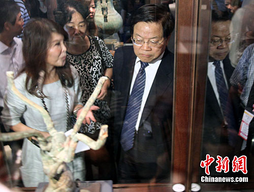 9月7日,中華文化聯誼會名譽會長蔡武一行參訪臺灣歷史博物館。圖為博物館副館長為蔡武擔任展覽解說,觀賞珍貴館藏。中新社記者 劉舒凌 攝