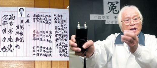 15年前在空戰(zhàn)部服役的上兵江國慶,被控奸殺謝姓女童遭槍決后,他的父親江支安(已故,右圖)在自宅大門張貼誣害江國慶的“狗官”名單(左),提醒自己為兒子洗清冤情。(《聯合報》資料照片)