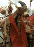 新埔枋寮義民廟于每年農(nóng)歷7月20日舉行的義民節(jié)活動(dòng),是臺(tái)灣客家人一年當(dāng)中最重要的盛典,也是本省目前保存較完整的民俗祭典之一。每逢此日,來自全省的客家鄉(xiāng)親總將義民廟擠得水泄不通,而放水燈、賽神豬及羊角競長等祭祀活動(dòng),更將活動(dòng)烘托得熱鬧非凡。 義民節(jié)祭祀活動(dòng)起源于清道光15年(1835年),附近各大莊為了紀(jì)念先烈義行,便選定農(nóng)歷7月20日舉行祭典,由各大莊輪值祭祀。輪值的莊頭除了要主持祭典外,還要負(fù)責(zé)牲品,安排戲班及設(shè)宴請客,由于每個(gè)村莊隔15年輪值一次,所以每一莊頭無不竭盡全力將祭典辦得熱熱鬧鬧,其中不乏有互相較勁的意味。 每到義民節(jié)前夕,輪值的莊頭便家家戶戶張燈結(jié)彩,殺羊宰豬迎接這天的來到。大體說來,義民節(jié)最主要的目的在超渡死難義民,同時(shí)亦超渡一般游魂,故在精神層面上與中元普渡相去不遠(yuǎn),祭典活動(dòng)也與基隆中元祭相仿,有放水燈、起燈篙、糊大士爺、神豬競重、羊角競長及普渡等活動(dòng)。 祭典通常為農(nóng)歷7月18~20日,第一日為“入壇”,廟前即登起高達(dá)數(shù)丈的燈篙,招請諸方神明及各路野鬼來,廟門前尚請專司供品分配的鬼王——大士爺坐鎮(zhèn),并舉行祭祀,誦經(jīng)聲終日不斷;第二日于廟前的鳳山溪施放水燈,超渡水中孤魂,引渡西方極樂世界,每年值此夜晚,鳳山溪畔萬頭攢動(dòng),溪中燈火連綿成河,場面之大不下于基隆中元祭。 7月20日是祭典的最高潮,鄉(xiāng)民們以豬、羊、雞、鴨等牲禮普施,供祭孤魂野鬼,祭典中少不了各種陣頭表演,其中客家山歌競唱更將客家風(fēng)情展現(xiàn)無遺,所有的祭典活動(dòng)中最引人矚目的莫過于賽神豬及羊角競長,名列前茅的大豬公及老山羊,皆以華麗的高塔裝飾,所有得獎(jiǎng)的牌匾懸掛兩側(cè),每只神豬均達(dá)千斤以上,羅列于廟埕之前,場面十分壯觀;而老山羊則眼戴墨鏡、口銜煙斗,一副老紳士的打扮,十分有趣。神豬與老羊皆于20日當(dāng)天中午12點(diǎn)至下午3點(diǎn)間陳祭廟前,并在傍晚列于街道,供人參觀。普渡大約在下午4點(diǎn)左右結(jié)束,此時(shí)廟前雜耍、賣藝的攤販,看戲、進(jìn)香的人潮逐漸散去;但輪值村莊上盛大的宴席才正要開始,直到午夜時(shí)分,大士爺像在熊熊火焰中化為灰燼,一年一度的義民節(jié)盛典才告正式落幕。