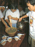 北埔在新竹各客家莊中,不僅以傳統聚落、古跡保存完好馳名,在特產小吃方面,也因長期人文薈萃,及近年觀光產業興盛,而發展出精致多元的鄉土風味。 北埔觀光興盛,特產小吃也頗為發達,一般常見的客家風味,如粄條、福菜、客家粿、姜絲炒大腸等,在北埔的餐館食鋪都可以吃得到;此外,農歷9月還有獨特的柿子大餐。而群山環抱的北埔,丘陵多,雨量豐沛,造就茶樹極佳的生長環境,所產茶葉質醇味甘,享譽國際。除了一般品茗,北埔的餐廳、茶坊,以傳統客家“吃茶”文化,發展出頗具特色的擂茶,濃郁的茶香、米香召喚著往來的游客。 擂茶 “擂茶”為海陸客家人特有的飲食習慣,由于其主要原料——米仔、茶葉,以及擂缽、擂棍等道具,輕巧易攜帶,客家先民由大陸渡海來臺時,便將此項傳統一起帶到臺灣來了。 擂茶的作法,是將綠茶、花生及芝麻等基本配料,依次放入擂缽里,以擂棍研磨,并不時加入少許冷水,續放入紫蘇、香菜、食監等材料,約15分鐘左右,擂缽里的茶漿變成墨綠色后,就可沖入開水一起食用,濃烈的米香、花香味,和著淡淡的茶香,吃起來別具風味。擂茶除搭配糕餅、米粿等茶點食用外,還可在研擂過程中加入米仔、四季豆、雪里紅、豆干等配料,成為營養可口的正餐。北埔的擂茶店,以廣福茶坊、北埔擂茶及番婆坑客棧最具代表。 芋頭餅·蕃薯餅 清末民初,臺灣物質缺乏,客家先民以芋頭及蕃薯為餡,制成中秋月餅,從此成了客家糕餅的代表。來到北埔的游客總要帶上幾盒,隆源、瑞源、新合春都是近百年歷史的老店,強調純手工作法,制作出來的芋頭餅及蕃薯餅,油而不膩,皮酥而不焦,內餡綿細,入口即化,其中瑞源所賣的芋頭餅及蕃薯餅,因甜度較低,較符合年輕人的口味。 柿餅·柿子大餐 九九飲食店 地址 南興街152號 電話 (03)580-3226,580-2305 營業時間 1100~2030 店內特色 柿香糯飯、柿醋溜魚、柿子雞湯 北埔的柿餅名氣雖不及新埔,但當地餐廳業者巧思融合客家菜肴的美味與柿餅的清香,開發出一道道風味獨特的柿子大餐,蔚為當地特色。傳統客家菜味道咸重,而風干過的柿餅則具有獨特的甜香,結合兩者的柿子大餐清香爽口而不油膩。北埔推出柿子大餐的餐廳以九九飲食店最道地,每年10~12月柿子飄香時節供應。 廣福茶坊 地址 北埔村10號 電話 (03)580-4543 營業時間 1000~翌日0200 店內特色 擂茶 與天水堂二房對街相望的廣福茶坊,賣的茶相當多樣化,由客家傳統擂茶、北埔特產膨風茶,到梨山、阿里山等地的高山茶,應有盡有。這里的擂茶由北埔農會專人指導,特別講究配料。茶坊里滿溢清新茶香,而挑高的空間設計,正可俯看天水堂二房疊疊層層的院落,別有一番韻味。 北埔食堂 地址 北埔街4號 電話 (03)580-1156 營業時間 0900!1400、1630~2030 休息時間 每月第二、四個周二 店內特色 姜絲炒大腸 位于慈天宮廟埕前方的北埔食堂,賣的是道地客家傳統菜肴,古樸的木制桌椅,舊時農家所用的木質飯筒及菜櫥,加上墻上一幅幅老電影海報,讓店里充滿濃濃懷古氣息。 老街粄條 地址 廟前街31號 電話 (03)580-3871 營業時間 平日0900~1730 假日0900~1930 店內特色 粄條、蒜絲大腸 老街粄條在懷舊中帶了點粗獷味道,厚實的木制桌椅、墻角的土角墻面、老縫紉機、舊式火鍋……,都是主人特意設計,主人賣了十幾年的客家粄條,早有口碑,這里的粄條軟Q滑溜,口味道地,煮法上則干、湯、炒各有所長。此外,姜絲大腸也是店里的招牌菜。 |