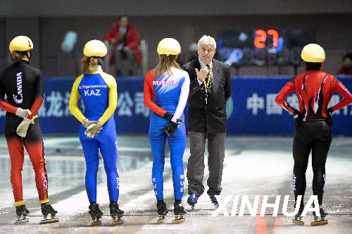 2月22日,短道速滑當值主裁判雅努斯(右二)警告選手不要消極比賽。當日,在第24屆世界大學生冬季運動會短道速滑女子3000米半決賽中,周洋所在的第一組因選手比賽速度過慢而兩次被判“消極比賽”,最終全組被取消比賽資格,最有希望奪金的周洋因此失去了再奪一枚金牌的機會。