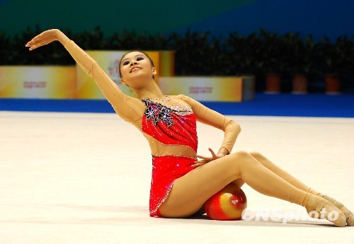 10月20日,中國第十一屆全國運動會進入第四天的比賽。全運賽場熱火朝天,如火如荼。各路健兒各展英姿,奉獻了一場場競技好戲。圖為十九日晚于山東德州體育中心體育館舉行的十一運會藝術體操個人全能比賽中,廣西隊的鄧森悅藝壓群雄,獲得了十一運會藝術體操個人全能冠軍。中新社發 尹傳偉 攝
