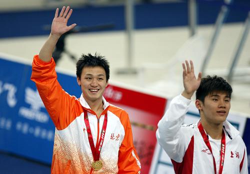 10月19日,北京隊選手張琳(左)在頒獎儀式后向觀眾致意。當日,在第十一屆全國運動會男子200米自由泳決賽中,張琳以1分46秒12的成績獲得冠軍。