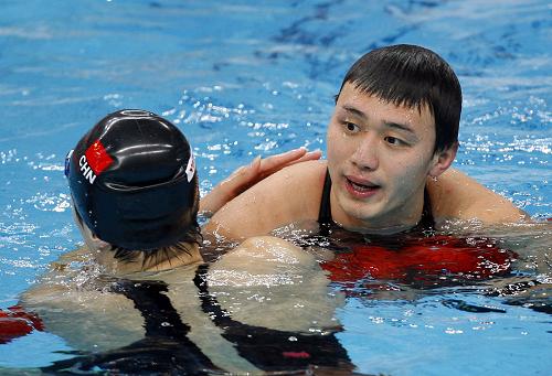 10月19日,北京隊選手張琳(右)在比賽后接受祝賀。當日,在第十一屆全國運動會男子200米自由泳決賽中,張琳以1分46秒12的成績獲得冠軍。