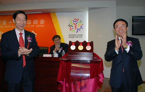 第十一屆全國運動會組委會12月18日在北京召開新聞發布會,正式公布十一運會獎牌樣式。圖為十一運會組委會副主任、國家體育總局副局長馮建中(左)與十一運會組委會副主任、山東省副省長黃勝(右)為獎牌揭幕。(曹亮 攝)