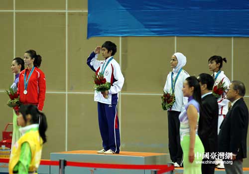 中國臺灣網11月18日廣州消息 在17日的廣州亞運會跆拳道女子46公斤決賽中,中華臺北隊17歲的小將黃顯詠以6:3戰勝約旦對手達娜·圖蘭,為中華臺北隊再添一金,登上最高領獎臺。(記者 鐘寶華)