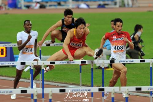 11月22日,在2010亞運會田徑男子110米欄預賽中,劉翔13秒48小組第一進決賽。(記者翁奇羽 攝影報道)