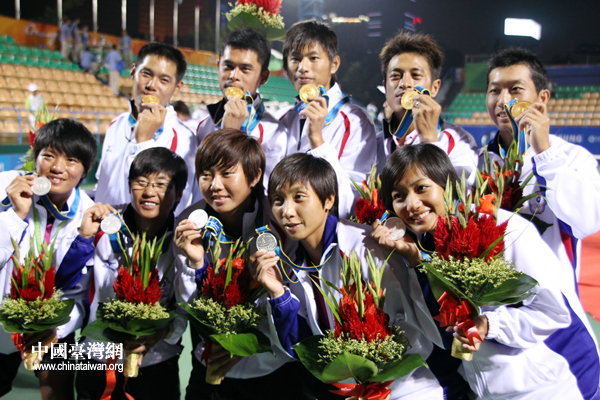 14日下午,軟式網球男女團體賽中華臺北隊分獲金銀牌,圖為獲獎男女選手一起展示金銀牌。(中國臺灣網 鐘寶華 攝)