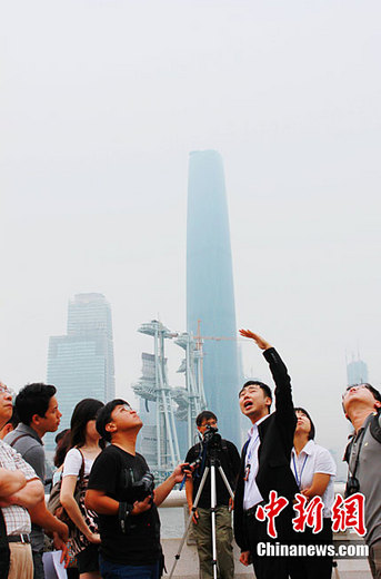一隊境外記者在廣州亞運會開幕前夕到海心沙采訪。圖為廣州有關部門的職員向記者介紹廣州塔的建設情況。中新社記者 張傳熙 攝