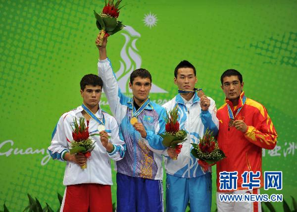 11月25日,冠軍哈薩克斯坦選手謝里克 薩皮耶夫(左二)、亞軍烏茲別克斯坦選手烏克塔姆忠 拉赫蒙諾夫(左一)、并列季軍蒙古國選手扎爾嘎勒 奧特根扎爾嘎勒(右二)和中國選手麥麥提圖爾孫瓊在頒獎儀式上。當(dāng)日,第16屆亞運(yùn)會拳擊項(xiàng)目男子69公斤級頒獎儀式舉行。新華社記者公磊攝