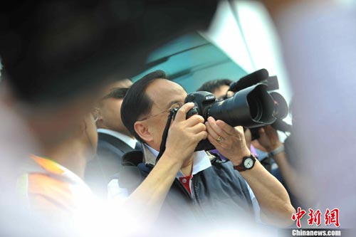11月23日上午,廣州亞運會公路自行車女子個人賽開戰。香港特區行政長官曾蔭權到場觀戰,并舉起相機拍攝開賽的精彩畫面。 中新社記者 柯小軍 攝