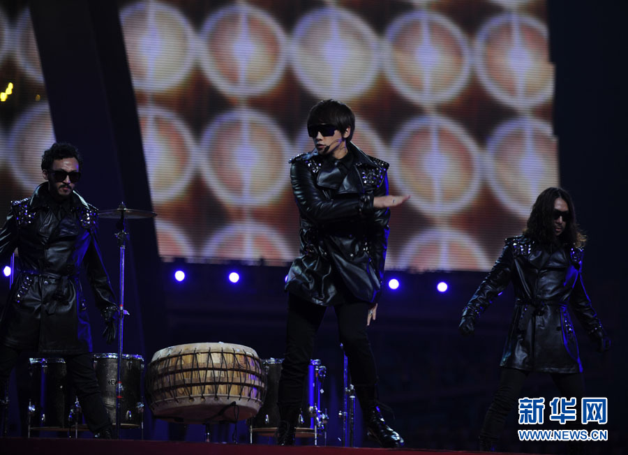 11月27日,韓國歌手鄭智薰(Rain )在文藝表演中演唱。當日,第16屆亞運會在廣州市海心沙島舉行閉幕式。 新華社記者公磊攝