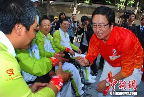 5日,廣州亞殘運會形象大使、央視知名主持人白巖松與亞殘運殘疾人志愿者打招呼。 作 者:程景偉