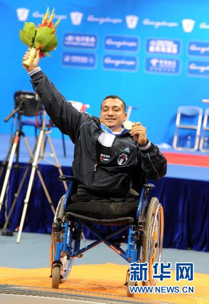 12月13日,約旦選手奧馬爾 卡拉達在領取獎牌后向觀眾致意。當日,約旦選手奧馬爾 卡拉達在廣州2010年亞殘運會男子A組48公斤級舉重比賽中,以167.5公斤的成績奪得亞殘運會舉重比賽的首枚金牌。新華社記者范長國攝