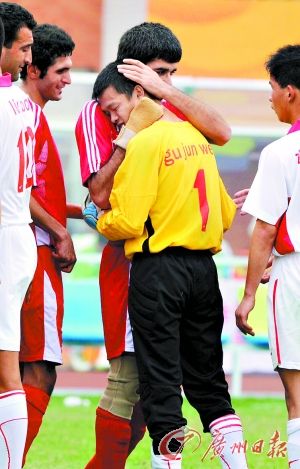 7人足球賽場充滿溫情,圖為賽后伊朗隊(duì)員與中國隊(duì)員擁抱。
