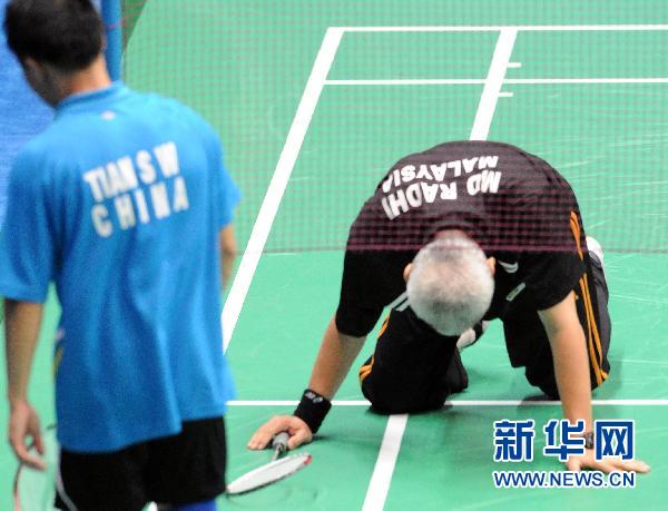 12月14日,在廣州2010亞殘運會羽毛球賽場上,中國選手田時偉對決馬來西亞選手朱哈里的男子單打站立一級半決賽,就像林丹大戰(zhàn)李宗偉,以精彩絕倫的交鋒展開一場“瑜亮之爭”,又以催人淚下的悲情畫上句號。當中國羽毛球選手田時偉丟下拍子、慶祝闖入決賽的喜悅時,他的對手馬來西亞球員拉迪 朱哈里仰天長嘆,流下熱淚。得分時雙拳緊握,為抵抗傷痛不時揚起球拍,朱哈里用自己的方式詮釋了什么叫做“雖敗猶榮”。這是馬來西亞選手拉迪 朱哈里(右)失分后懊悔跪地。 新華社記者王松攝