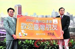 萬慶良向臺灣朋友發出其親筆簽名的邀請函,熱情地向臺灣民眾介紹廣州亞運、誠摯邀請臺灣民眾共享亞運樂事,體驗亞運之旅。他表示,廣州愿意為臺灣運動員參加廣州亞運會提供最大的協助和便利以及最好最周到的服務,相信臺灣運動員將繼北京奧運會后再次感受到大陸民眾的熱情和濃烈的主場氛圍,也期待臺灣運動員能夠在亞運會上發揮優勢項目,取得最好成績。