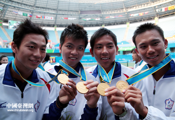 中華臺北隊男網(wǎng)團(tuán)體獲得金牌,圖為選手們展示金牌,左一為“亞洲一哥”盧彥勛。(中國臺灣網(wǎng) 鐘寶華 攝)