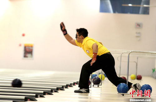 12月14日,廣州亞殘運會天河保齡球館,單人賽TPB1決賽中,來自中華臺北的選手廖宏昌放手一搏,體現了不屈不撓、頑強拼搏的體育精神。中新社發 張美安 攝