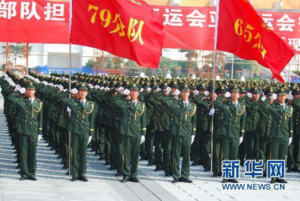 10月23日,武警官兵在宣誓。當日,武警部隊在廣州舉行亞運安保誓師動員大會。至此,擔負亞運安保現場執勤的武警官兵全部走上執勤崗位,這標志著武警部隊亞運安保工作已經全面啟動,進入實質保衛階段。新華社發(張大崗攝)