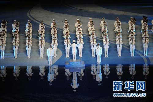 11月12日,第16屆亞洲運(yùn)動(dòng)會(huì)開(kāi)幕式在廣州海心沙島舉行。這是中國(guó)人民解放軍軍樂(lè)團(tuán)演奏迎賓曲。 新華社記者吳曉凌攝