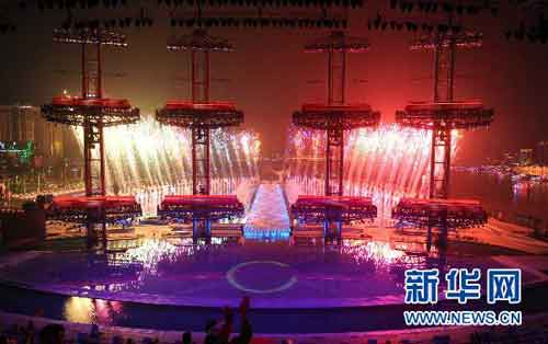 11月12日,第16屆亞洲運(yùn)動(dòng)會(huì)開(kāi)幕式在廣州海心沙島舉行。這是倒計(jì)時(shí)的焰火表演。 新華社記者郭勇攝