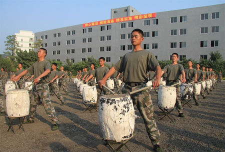 每天早上5點,緊密排列的六層宿舍樓里,燈光齊刷刷地亮起,隨之,在地面混合著煤渣和沙子的簡易操場上,來自廣州軍區75200部隊的數百名士兵演員迅速集合、列隊、擺陣型,一天的訓練開始了。12月的廣州依舊寒冷未至,溫暖舒適的氣候多少讓這群年輕的戰士感到欣慰。