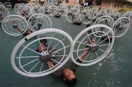 為了高標準完成動作,士兵們每周還會召開一次“諸葛亮會”,獻言獻策,有不少奇招妙點就出自于戰士們,“可以說我們是巧練加苦練。”在訓練場地上,記者就見到,地面上用粉筆畫出了無數條長度相同的線條,有士兵解釋說,節目需要800人圍成8個圓圈勻速跑動,為了達到最佳的視覺效果,必須讓人與人之間始終保持1米的距離,同時保持好隊形,難度非常大,為此他們想出了這樣的辦法,“用1米的尺子畫出許多線條,讓訓練隊員反復看反復跑,通過上千次的重復跑動,形成分毫不差的距離感。”