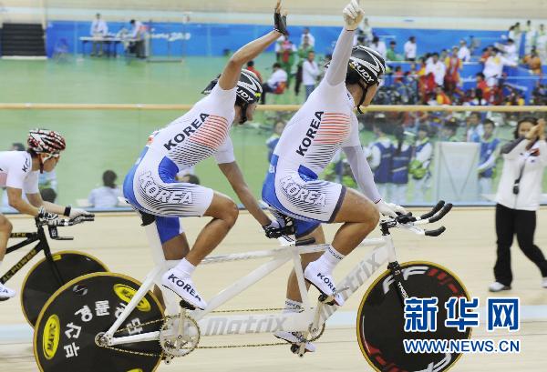 12月13日,韓國選手金正奎、宋正勛在比賽中。當日,在廣州2010年亞洲殘疾人運動會場地自行車混合雙人自行車4公里追逐賽中,韓國選手金正奎、宋正勛獲得金牌。新華社記者盧漢欣攝