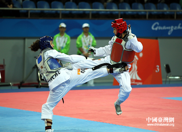 中國臺灣網11月17日廣州消息 在剛剛結束的廣州亞運會跆拳道女子46公斤決賽中,中華臺北隊17歲的小將黃顯詠以6:3戰勝約旦對手達娜·圖蘭,為中華臺北隊再添一金。