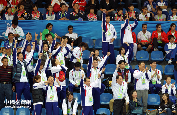 中華臺北跆拳道隊隊員、教練員為黃顯詠助威(中國臺灣網 鐘寶華 攝)