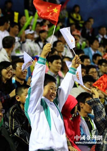 廣州亞運棒球決賽吸引了大批觀眾到場觀戰。圖為給中華臺北隊加油的大陸小觀眾。(中國臺灣網 沈鵬 攝)