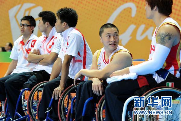 12月14日,在2010年亞殘運會中國對陣阿聯(lián)酋的輪椅籃球賽場邊,陳海江(右二)與年輕球員交流。 34歲的陳海江是中國男子輪椅籃球隊最年長的球員。13年前的一場可怕事故讓這位內(nèi)蒙古小伙腰部以下完全癱瘓,陳海江的人生陷入灰暗。是籃球重新燃起陳海江的希望,6年的輪椅籃球生涯讓陳海江的人生重新“站”了起來!新華社記者劉大偉攝