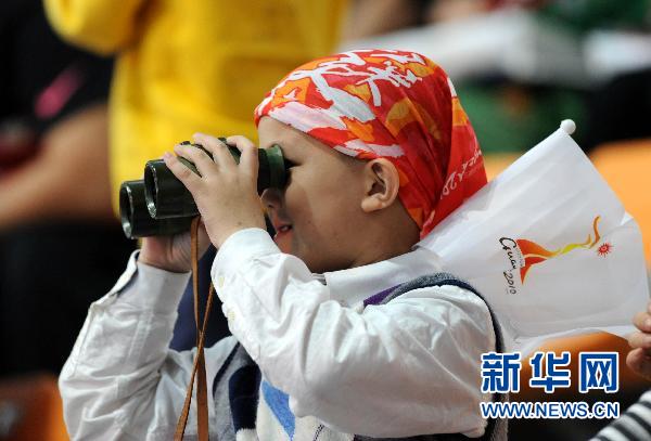 11月27日,頭戴“志愿彩”的小觀眾用望遠鏡觀看閉幕式前的表演。當日,第16屆亞運會閉幕式在廣州市海心沙島舉行。新華社記者李勇攝