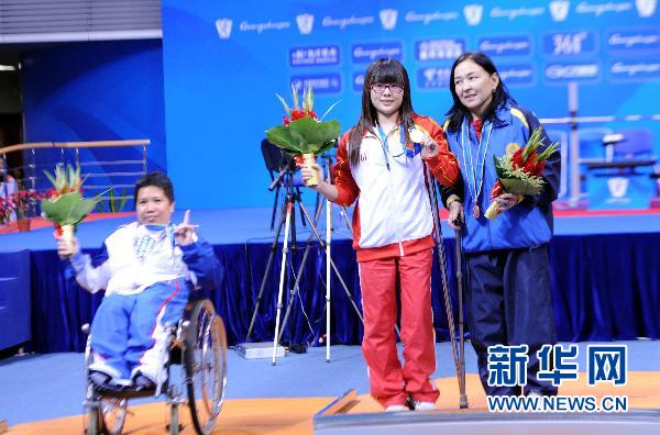 12月14日,冠軍中國選手崔哲(中)、亞軍菲律賓選手阿切列 吉翁(左)和季軍哈薩克斯坦選手卡比拉 阿斯卡洛娃在頒獎儀式上。當(dāng)日,在2010年廣州亞殘運會女子44公斤級舉重比賽中,中國選手崔哲以95.0公斤的成績奪得金牌。新華社記者范長國攝