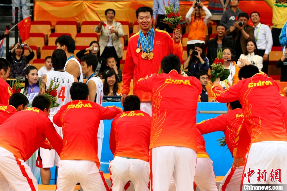 11月26日晚,2010亞運會男籃決賽,中國隊77-71戰勝韓國奪冠。圖為中國隊隊員向王治郅鞠躬致意。中新社記者 富田 攝