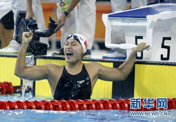 11月13日,中國隊選手唐奕在比賽后慶祝。當日,在廣州奧體游泳館舉行的第16屆亞運會女子4X100米混合泳接力決賽中,中國隊以3分57秒80的成績奪得冠軍。新華社記者費茂華攝