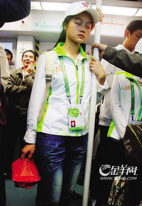 嬌弱身軀,稚嫩面龐,地鐵里站著倚桿睡著了,一臉倦累,手中還拎著個盒飯。衣服和胸牌顯示了她的身份:廣州亞運志愿者。這一幕,被有心人拍了下來,掛上網(wǎng)。她迅速躥紅,并被稱為“最美的‘亞運妹妹’”。
