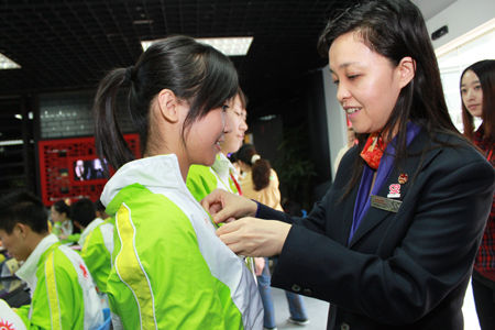 團省委副書記為優秀亞運志愿者代表戴“創先爭優黨團員志愿者徽章”