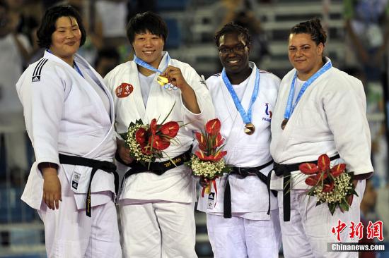 8月13日下午,第26屆深圳世界大學生運動會柔道決賽在會展中心上演。在女子78公斤以上級柔道比賽中,中國選手秦茜戰(zhàn)勝韓國名將金誽永,奪得大運會中國代表團首枚金牌。圖為頒獎儀式。中新社發(fā) 金碩 攝