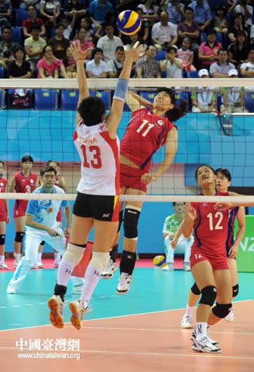 中國隊(duì)員13號陳伊娜網(wǎng)前攔截中華臺北隊(duì)11號球員吳淑芬的大力扣球。(中國臺灣網(wǎng) 董憲超 攝)
